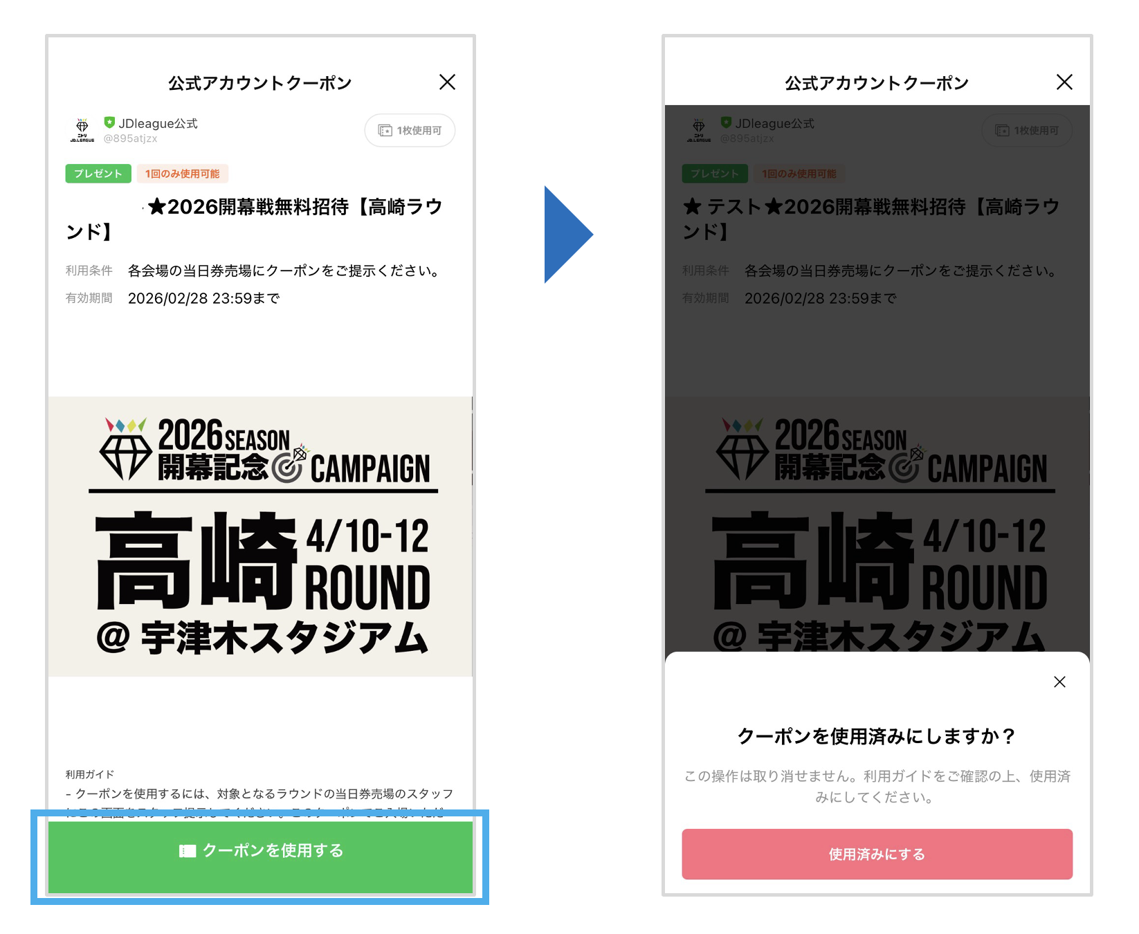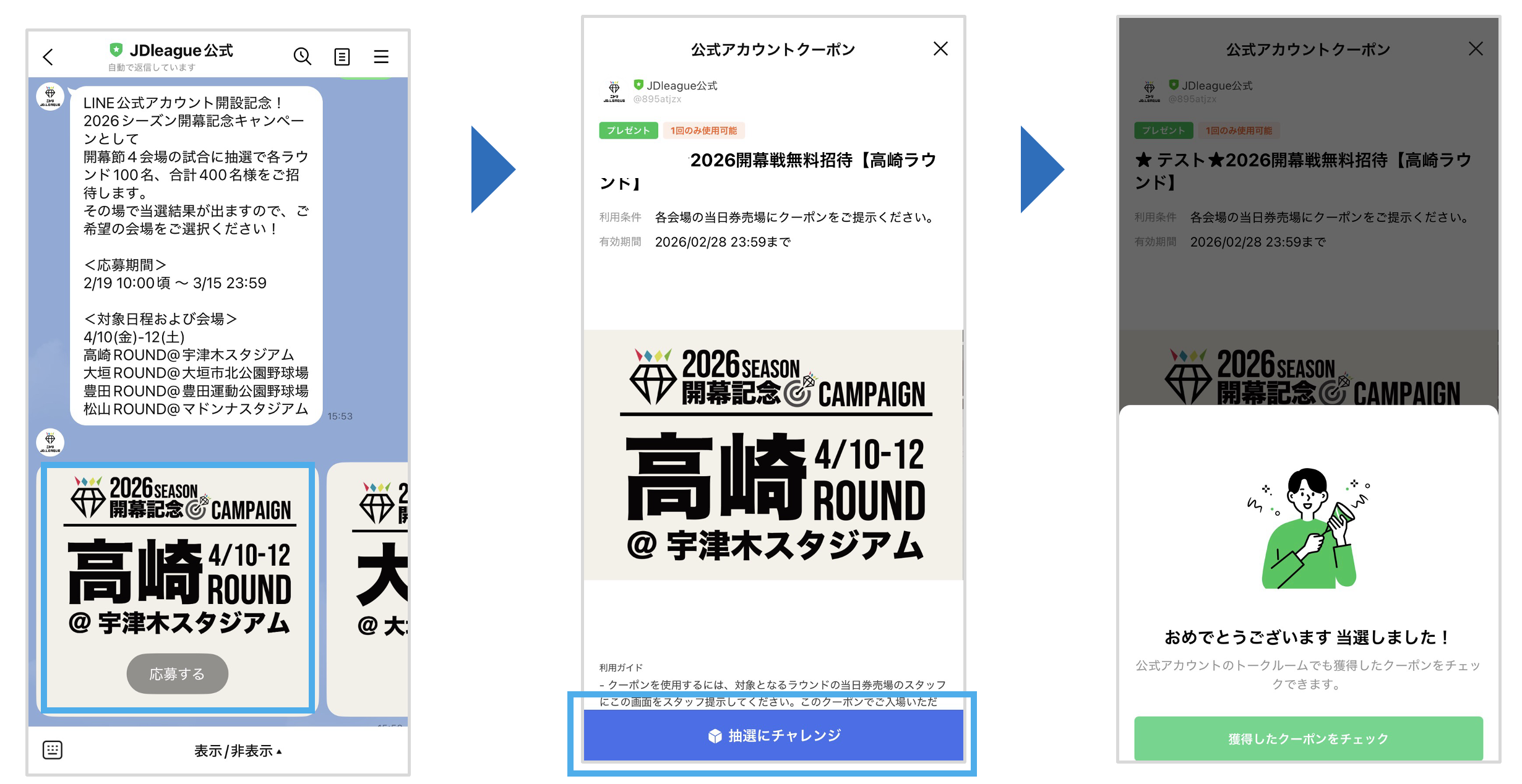 ②対象となる試合会場の当日券売場に当選したクーポンをご提示いただき、招待券(紙チケット)と交換ください。