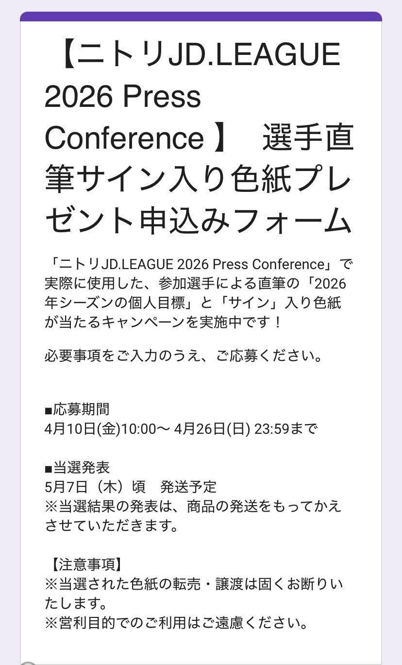 ニトリJD.LEAGUE 2026シーズンの開幕を記念した特別企画として、「ニトリJD.LEAGUE 2026 開幕前 Press Conference」にて、16チームの代表選手が個人目標の発表時に使用した目標&サイン入り色紙を、ファンの皆さまへプレゼントいたします!