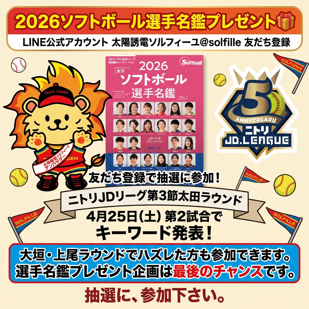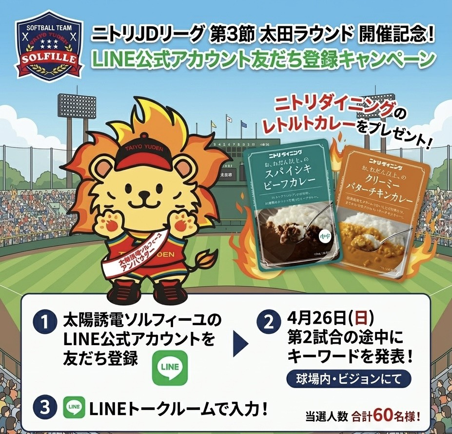 2日間にわたり、太陽誘電公式LINE友だち登録キャンペーンを実施します。25日(土)は、友だち登録をいただいた方の中から抽選で20名様に「2026ソフトボール選手名鑑」をプレゼトします。第2試合の途中にキーワードを発表しますのでお見逃しなく(1節大垣、2節上尾ではずれの方も参加できます)。26日(日)は、友だち登録をいただいた方の中から抽選で60名様に「ニトリダイニング レトルトカレー」をプレゼントします。